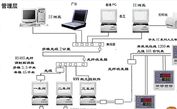關(guān)鍵詞:光纜 監(jiān)控 以太網(wǎng)一、概述四川制藥股份有限公司在全廠局域網(wǎng)設(shè)計(jì)中采用光纖深入動(dòng)力車間兩臺(tái)喬納森公司550空壓機(jī)運(yùn)行情況控制,加入調(diào)度管理系統(tǒng),將以太網(wǎng)滲透到工業(yè)現(xiàn)場(chǎng)從而實(shí)現(xiàn)辦公自動(dòng)化與工業(yè)自動(dòng)化的無縫結(jié)合,給廠部調(diào)度室、總工隨時(shí)決策提供幫助。充分運(yùn)用AI系列智能儀表組建現(xiàn)場(chǎng)總線型計(jì)算機(jī)監(jiān)控系統(tǒng)連接到局域網(wǎng)上共享信息資源。使車間、調(diào)度室、廠辦計(jì)算機(jī)組成對(duì)等以太網(wǎng),實(shí)現(xiàn)資源共享管控一體化。二、系統(tǒng)架構(gòu)我們將傳統(tǒng)的服務(wù)器下放至現(xiàn)場(chǎng)充當(dāng)服務(wù)器,計(jì)算機(jī)中安裝WWW網(wǎng)絡(luò)版工控軟件,現(xiàn)場(chǎng)的儀表數(shù)據(jù)以數(shù)字信號(hào)的形式由服務(wù)器采集并保存于服務(wù)器中。 調(diào)節(jié)器AI-808AXL2L2S4巡檢儀AI-706MAJ0J0J0L2L2S AI表采集的壓力、流量、溫度、位移、液位、流量等數(shù)據(jù)存儲(chǔ)在客戶服務(wù)器WWW網(wǎng)絡(luò)版工控軟件數(shù)據(jù)庫,在計(jì)算機(jī)上按裝100M網(wǎng)卡,接上光纖收發(fā)器,通過四芯光纜送至500米(可達(dá)