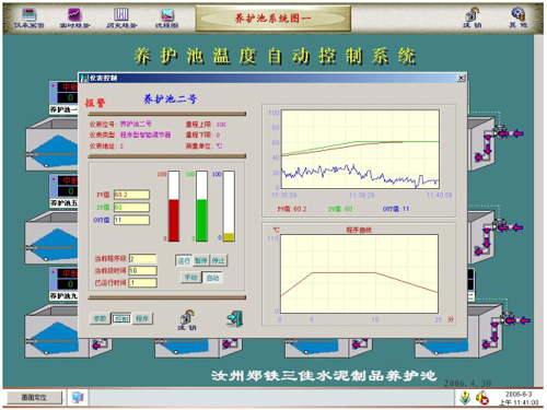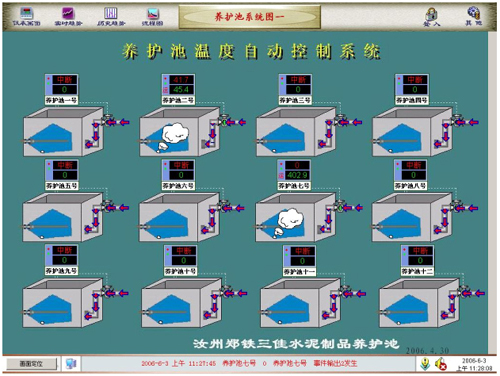 【水泥養(yǎng)護池1-12】的所有控制信息與數(shù)據(jù)信息都在控制室計算機上統(tǒng)一管理、分配。在計算機上對車間溫度進行全方位的監(jiān)控,數(shù)據(jù)采集和各項事務(wù)的處理。