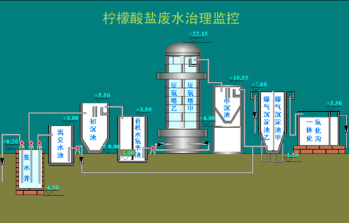 宜興協(xié)聯(lián)檸檬酸廢水處理廠采用厭氧加好氧處理工藝,其中好氧部分采用SBR法處理。SBR是處理高濃度有機廢水的理想途徑之一。一期設計日處理100立方/小時,設2座爆氣池2座厭氧塔,氧化溝,有機調(diào)節(jié)池等12座處理池??刂圃O備布置分散,要求實現(xiàn)總線型遠程檢測控制。