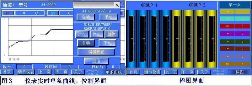 4、圖形豐富:具有豐富的圖形畫面如:1~8通道【數(shù)據(jù)畫面】一目了然;單臺儀表【實時畫面】模擬點信息、曲線、數(shù)據(jù)、手/自動、程序控制、溫度和壓力的畫面進行分組顯示;儀表控制參數(shù)修改操控盡在掌控中;形象的【棒圖畫面】高低楚落;分析工藝參數(shù)實時-歷史可選1~4條曲線組合畫面變化無窮;歷史數(shù)據(jù)報表海量記錄;報警應(yīng)答報表隨心所悅;工藝流程盡收眼底;